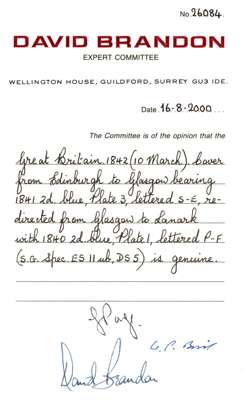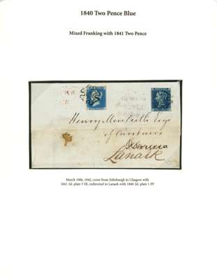 1842 (March 10th) cover Edinburgh to Glasgow with 1840 2d blue plate 1 (PF) and 1842 2d blue plate 3 (SE) cancelled black MCs, redirected to Lanark, Brandon certificate (2000), a fine example of mixed franking SG 5, 14