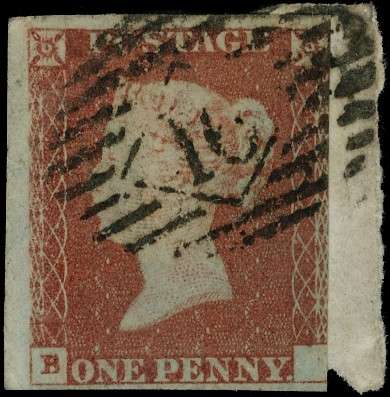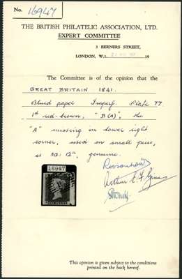 1841 1d red-brown Plate 77, just touched (on right side) to good margins, showing the variety B BLANK, used on small piece, by London numeral '16', a spectacular and rare variety. BPA Certificate (1951) SG 8var, Spec.BS66a, £22,000
