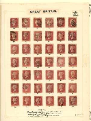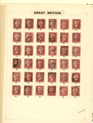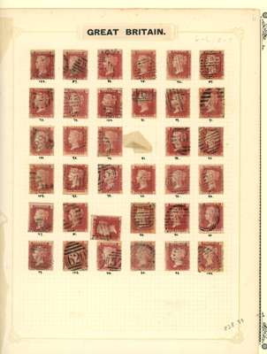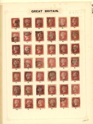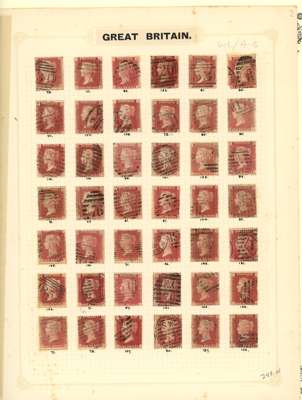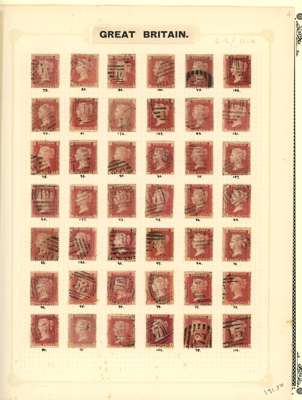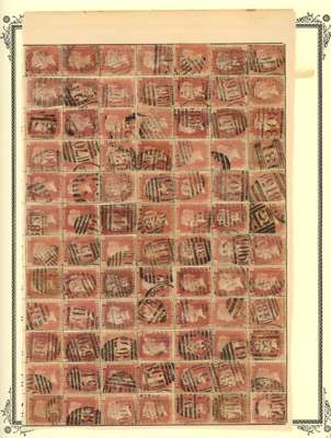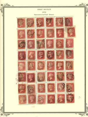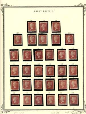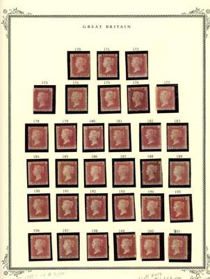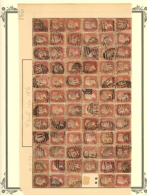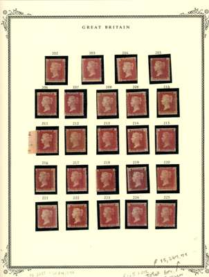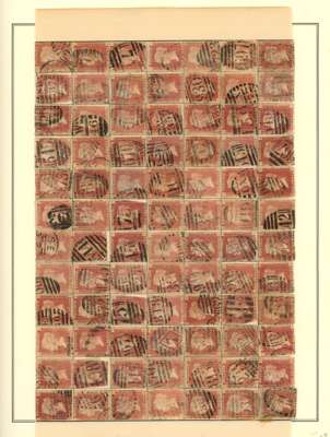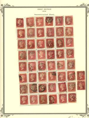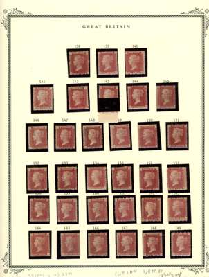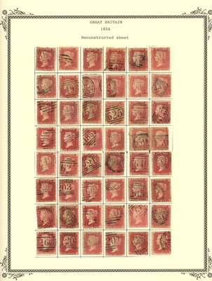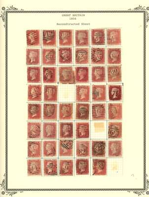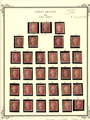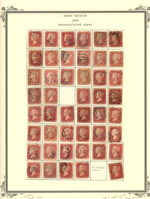 1864 mint 1d red plate collection on leaves including plates 71 to 225 (no 77) plate 143 bottom marginal with part inscription, plus used reconstructed sheets on album leaves. Mixed condition with many good to fine (hundreds) SG 43/44