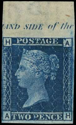 1858-69 2d blue Plate 7 (AH) imperforate imprimatur, top marginal with part inscription, fine unused, scarce. SG 45, Spec G2