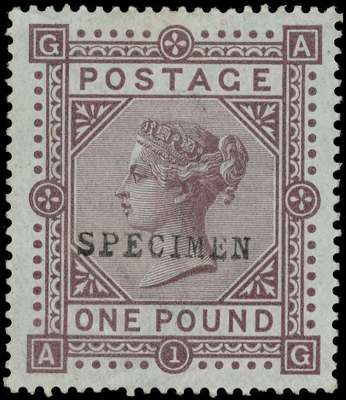 Great Britain 1883 Wmk Large Anchor £1 brown-lilac (AG) on blued paper, optd ‘SPECIMEN’ type 9, large part o.g. minor bend at lower left, otherwise fine and scarce. SG 132var, Spec. J127t
