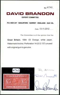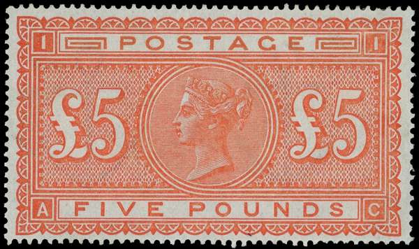 1882 £5 orange plate 1, white paper (AC) excellent...