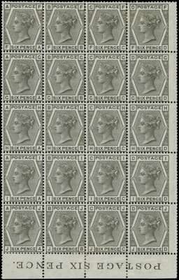 Great Britain 1876 6d grey Plate 15 (FA-JD) lower marginal block of twenty with intact selvedge and part marginal inscription, brilliant o.g. odd minor blemishes, still a magnificent and rare multiple, with fresh appearance. SG 147 £10,000+
