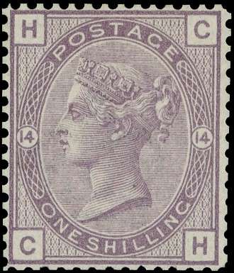 Great Britain 1882 1/- purple Plate 14 (CH) line perforated 14. Originally printed in this colour for the surcharged unified issue, however the Telegraph branch objected to the 1/- value which was subsequently cancelled before issue. This example originates from a small portion of the imprimatur sheet which was perforated line perf 14 and included in the souvenir albums for members of the "Stamp Committee of 1884". fine o.g. Very rare only 36 examples recorded. SG 163var
