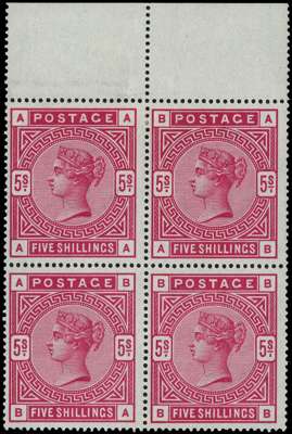 Great Britain 1883 5/- crimson, (AA-BB) top marginal block of four, brilliant large part o.g. with lower pair unmounted, very fine and fresh. SG 181