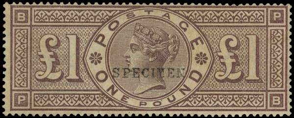 1884 £1 brown-lilac overprinted “SPECIMEN” with overall toning, re-gummed, still a collectable example. SG 185s