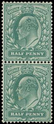 1902-10 ½d dull blue-green vertical pair, variety WATERMARK INVERTED, brilliant o.g. minor gum wrinkles and tone spot on surface of lower stamp, still a very rare wmk variety. SG 215Wi £5500+