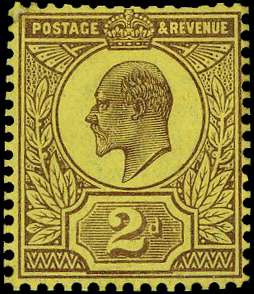 1909 2d Colour trial. Very fine example printed in dull purple on yellow, gummed, Crown watermarked paper. Produced for the proposed monocolour issue that was subsequently abandoned on the death of the King. Minor corner fault at top left neverthless very rare, no more than two or three examples of each colour recorded in private hands. Ex. "Aurelius" & "Minoru".