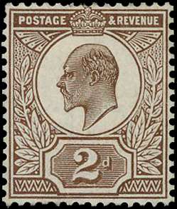 1909 2d Colour trial. Very fine example printed in brown on gummed, Crown watermarked paper. Produced for the proposed mono colour issue that was subsequently abandoned on the death of the King. Very rare, no more than two or three examples of each colour recorded in private hands. Ex. "Minoru".