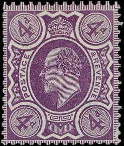 1909 4d Colour trial. Very fine example printed in purple on gummed, Crown watermarked paper. Produced for the monocolour issue using the original bi-coloured plates. Trimmed perforations at top left and a pulled perf at lower right neverthless very rare, no more than two or three examples of each colour recorded in private hands. Ex. " Aurelius" & "Minoru".