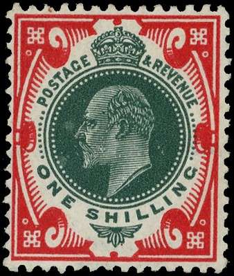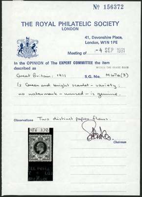 1911-13 Somerset House 1/- deep green & scarlet variety NO WATERMARK, fine o.g. minor paper flaws to surface and reverse due to perforation holds adhering to the gummed side, still a largely fine and rare item. RPSL Certificate (1991) SG 313var Spec.M47a, priced at £8,000