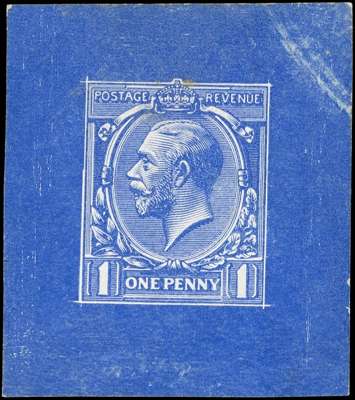1912 1d die proof, stage 5 in blue on thick unwatermarked paper (36x40mm) very fine and scarce. SG 357var, priced at £2750