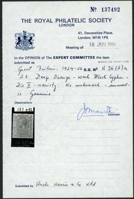 1924-26 2d orange (Die II) variety NO WATERMARK, brilliant large part o.g. fine and scarce. RPSL Certificate (1986) SG 421a