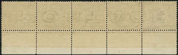 1912-24 9d agate, vertical strip of five with intact selvage at right, showing complete POSTAGE WATERMARK, misplaced variety, brilliant o.g. couple of light bends still, fine and scarce. SG 392var Spec. N29yb
