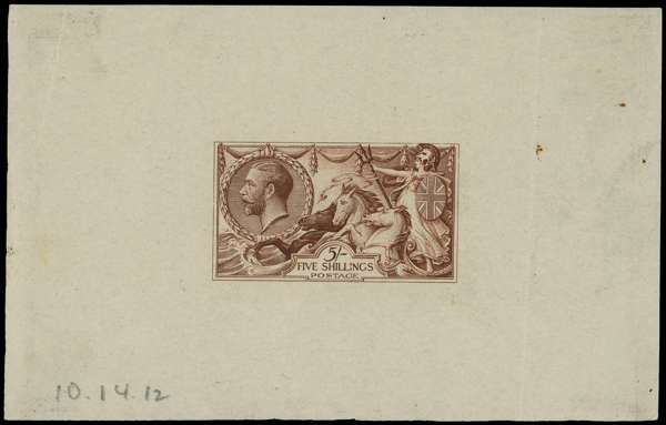 1913 Seahorse 5/- Die Proof State B, in red-brown on thin wove paper, endorsed in pencil ''10.14.12'' at foot, vertical bend at right clear of design, still fine and very rare. SG 401var
