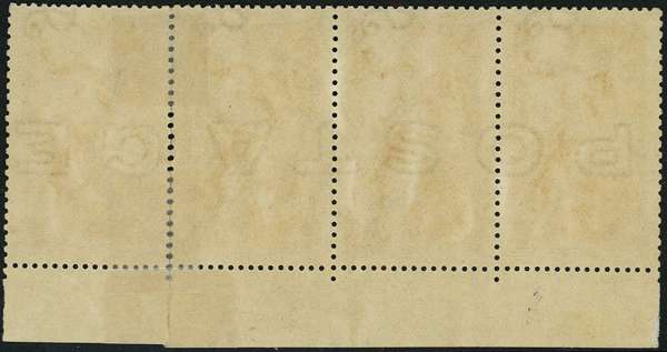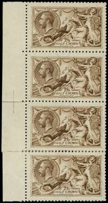 1915 2/6d yellow-brown, vertical strip of three and re-attached single (by hinges) showing complete POSTAGE WATERMARK, brilliant large part o.g. very fine and scarce. SG 406, Spec. N64 (6)yc, priced £11,000