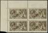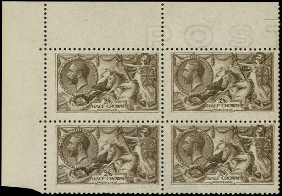 1915-18 2/6d sepia ‘seal-brown’ top left marginal block of four, showing ‘Muddy Print’ full unmounted o.g. couple of minor bends, still largely fine multiple. RPSL Certificate (1987) SG 408, Spec. N64(13) cat £2200+
