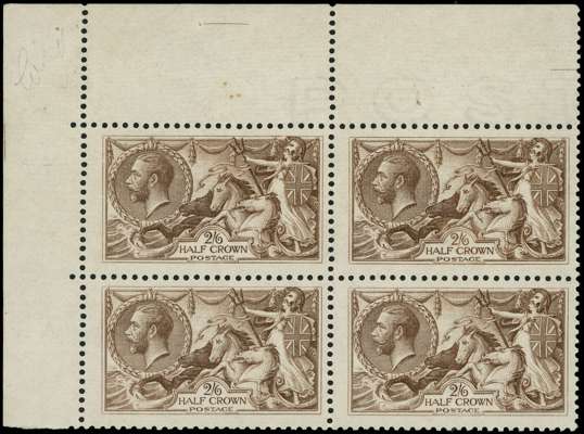 Great Britain 1918 2s6d Reddish brown. Very fine unmounted o.g. top left hand corner marginal block of four...