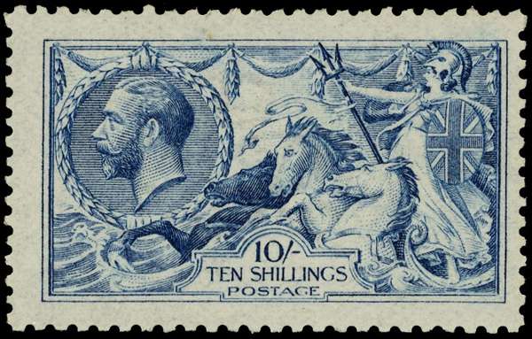 1915 10/- deep blue, large part o.g. fine. SG 411