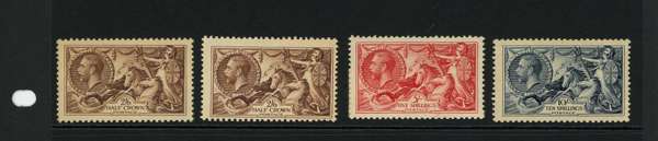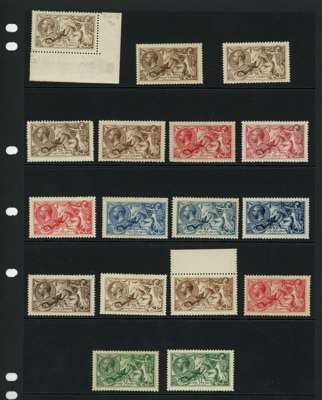 1913 Seahorse selection including 2s6d (3) one re-perforated, 5s, 10s corner crease, £1 green (fault) and £1 dull blue-green 1915 De La Rue 2s6d (3) and 2s6d l/r marginal warn plate, 10s centred to bottom, Bradbury 2s6d, 5s and 10s, plus re-engraved to 10s. Useful group (19) SG 399/452btn