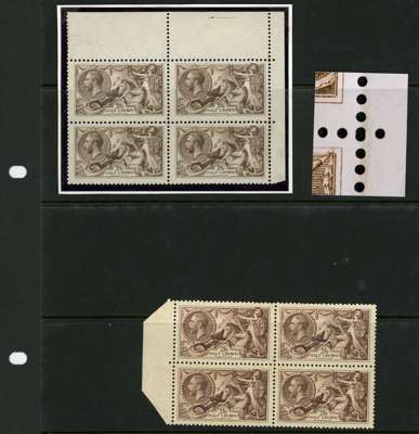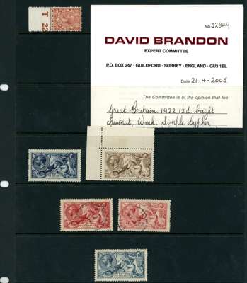 1913-34 KGV mint and used Seahorse assortment including: 1913 Waterlow 10/- indigo, DLR 1915 2/6d pale yellow-brown, top marginal, unmounted (sadly with tear at foot), 5/- bright and pale carmine shades, both used, Bradbury 1918 2/6d reddish brown, upper left marginal block of four with R.1/ 4 & R.2/ 4 re-entries, Bradbury 10/- dull grey-blue and 1934 Re-engraved 2/6d block of four, lot also includes 1922 wmk simple cypher 1½d single with T-22 control, generally fair to fine condition.