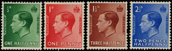 1936 KEVIII Definitive Essays Type B set of four in issued colours on gummed GvR wmkd paper, fine o.g. 1½d with pulled perf, still very fine and rare. SG 457-460var