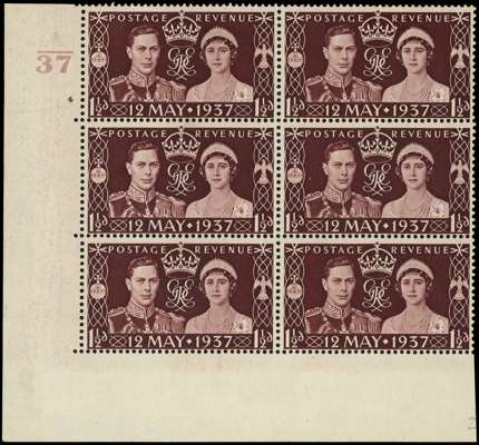 1937 Coronation 1½d maroon, Cylinder 4 (no dot) control A/37 block of six, RAY FLAW CORRECTED, fine o.g. (with top pair lightly hinged), very rare with only three sheets printed from cylinder 4 (no dot) with the ray flaw corrected, unpriced in GB Specialised Vol.II SG 461var Spec.Q10b