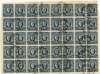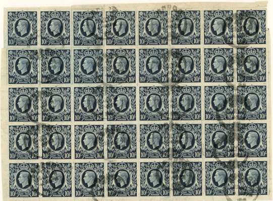 Great Britain 1939-48 10s dark block of thirty-eight (stamps 1 and 2 missing) showing re-entries ‘Broken Stem’ (R1/ 4) and ‘Blot on scroll’ (R2/5), margins trimmed in places, lightly cancelled with multiple parcel datestamps, plus a further block of six placed behind to give the impression of a complete sheet for display. A fine and rare multiple. (44)