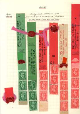 1941-42 ½d pale-green (2) and 1d pale scarlet (4) coil leaders codes W & X, with either three or four stamps attached, fine and scarce. SG 485-486