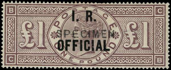 1885 £1 brown-lilac I.R. OFFICIAL overprint, lettered ‘CB’ overprinted “SPECIMEN” type 11, fine unused o.g. SG O11s/Spec. L9s