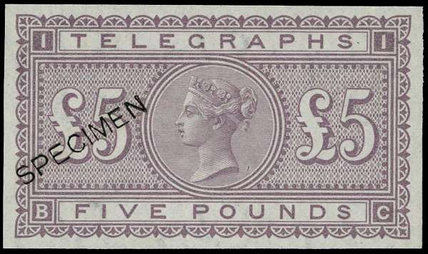 TELEGRAPH: 1876 £5 (BC) imperforate colour trial in dull mauve, optd ‘’SPECIMEN'' type 8, fine o.g, scarce. SG L237var