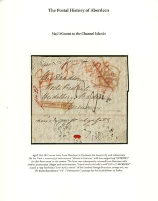 1842 (22th April) entire Aberdeen to Germany but incorrectly sent to Guernsey. On front manuscript 'Missent to Guernsey' with two supporting Guernsey cds's on reverse. The letter was subsequently returned from Germany with various charges and endorsements with transit marks "PAID/AT/ABERDEEN" in red, a fine "RETURNED FROM" of the London Foreign Branch in orange-red and the Baden h/s "WP" for 'Weiterporto' postage due for local Baden delivery. Most unusual.