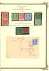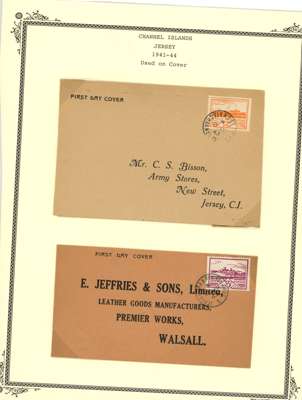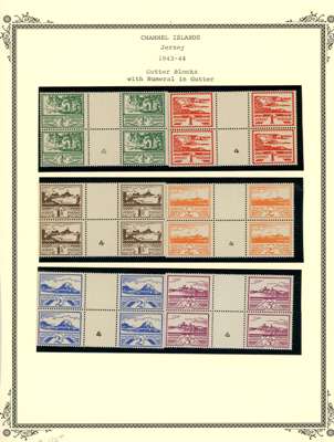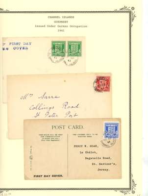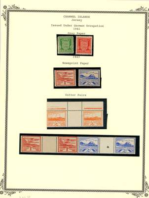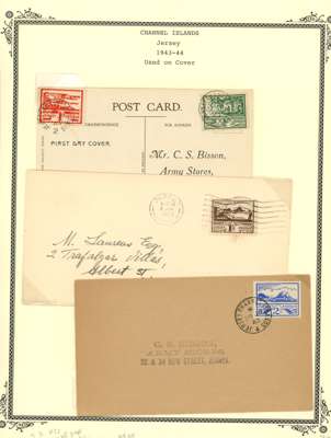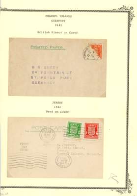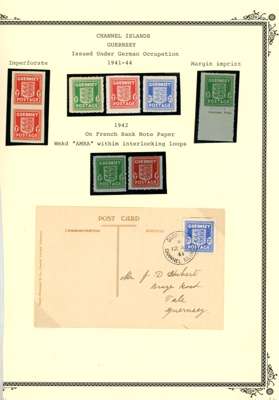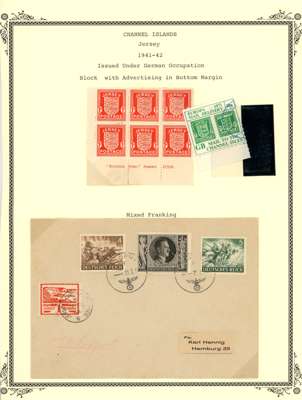 CHANNEL ISLANDS: on leaves including Guernsey Wartime issues to 2½d, 1d vertical imperf pair, 1d block of 6 with “EVENING POST” advert in bottom margin, 1940 KGV bisect on cover, 1941 2d orange bisect on postcard, 1940 Stamp Centenary bisect on local cover, Jersey 1943-44 Pictorial ½d to 3d in gutter blocks of 4 with ‘4’ numeral in gutter, plus various watime issues on covers. A useful group, condition mainly good to fine. (69)