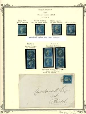 GB untidy accumulation, mainly used selection on leaves including 1840 1d black (RJ) on piece, 2d blue four margin with...