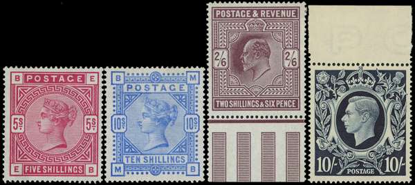 All reigns, mint and used collection in six albums. Mint includes 1887 Jubilees to 1s (both), 1883 2s6d, 5s and 10s, KEVII 1912 with shades/printings to 1s (4), 1d booklet pane of 6 (2), 2s6d purple bottom marginal example (light crease), 1924 and 1934 to 1s, a few booklet panes, 1939 square set, 1951 Festivals to £1, QEII booklet selection. Used includes 1840 2d blues (9) 3-4 margins, 1841 2d blue selection, 1841 1d red-brown selection including numbers in cross, ½d to 2d selection used in Malta, embossed 6d, 10d and 1s, seahorses 2s6d (13), 5s (6), 10s (3), re-engraved (2), plus a packet including a few pre-stamp entires, 1d black on cover (3). Would suit the on-line retailer. Condition a little mixed on the earlies still with many good to fine. (thousands)