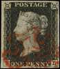 1840 1d black plate 3 (SL), four margins, wide at left, cancelled with crisp red MC, fine used