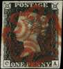 1840 1d black plate 4 (CA), four margins, cancelled with crisp red MC, fine used