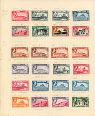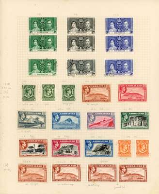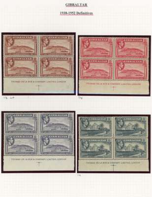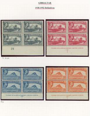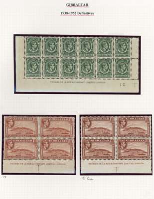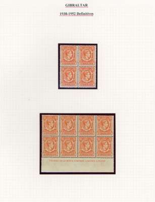 1938-51 set mint; collection of singles on leaves with all perfs (SG 124ab used), some heavy mounting otherwise fine; and collection of blocks on leaves to 5d, some affected by toning, plus £1 imprint block of eight (early printing with brown gum) and block of four (two unmounted), the low value blocks including 3d perf 14 imprint block. Mixed condition but a useful lot for resale