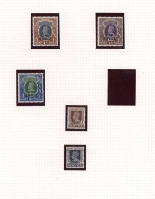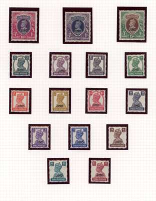 1937-43 KGVI mint collection on Godden leaves, including 1937-38 ‘JIND STATE’ set to 25r slate-violet & purple, 1941-42 ‘JIND’ set to 25r, and 1940-43 set to 12a lake, Officials 1937-40 types O17 & O18 opts part set to 2r, and later 1939-40 part set to 5r green & blue, generally fair to fine condition. SG 109-O85