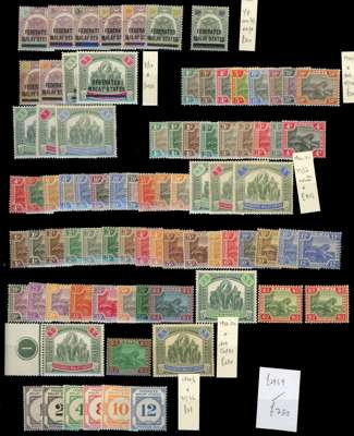 MALAYA FMS: Mint on card including 1900 to $2, 1900 to $5, 1904 to $5, 1922 to $5 (both), 1924 dues to 12c, mainly fine. (82)
