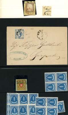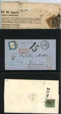 ITALY & ITALIAN STATES: 1850s-1870s mixed mint and used, including Papal States 1b greyish green on entire letter, Sardinia 20c blue on local cover to Trieste with forwarding agent markings and 10c brown used on piece with red cds, Tuscany 1856 large piece of Osservatore Triestino Newspaper franked by 2s black Newspaper Tax adhesive, tied by double-headed eagle cancel, Italy 1863 15c blue on cover from Messina to Girgati with Diena certificate 1974 and Switzerland 1850 10r red, black and orange-yellow, Rayon II, used, generally fair to fine condition.