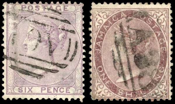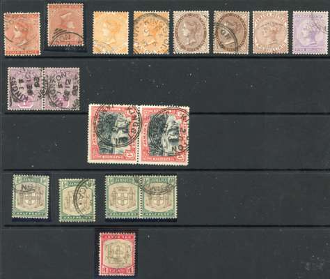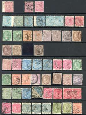 1859-1905 used collection (73) on Hagner sheet. Four GB used in Jamaica; SG Z9, 15 (inconspicuous crease), 54 and 92. 1860 set plus shades, also SG 3w (thinned), 8c $ flaw (small faults) and 6w; 1870 set plus SG 8w, 10w, 13a $ flaw (lightly cancelled, probably fiscal), 1883 set plus SG 20w, 22bw, and a few later with SG 33a (2) and 40w (apparently a slightly dry print)