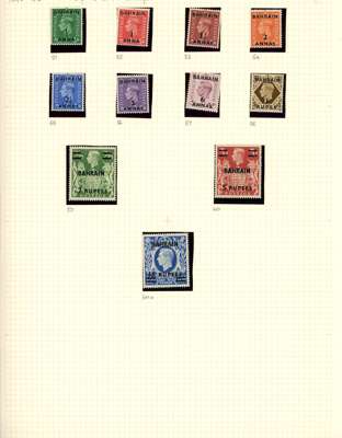 KGVI to early QEII mint collection of GB overprints on album leaves including, Bahrain 1948, 1950 to 10r on 10s, 1953 2R 0n 2s6d surcharge type II, 1955 to 10r on 10s with types II and III, 10r on 10s u/r corner marginal De La Rue block of 4, B.O.I.C.-M.E.F. 1943 to 10s, Eritrea 1948 1950 and 1951 to 10s on 10s, 1948 and 1950 postage dues to 1s on 1s, Kuwait 1948,1950 to 10r on 10s, 1952 10r on 10s type II surcharge, 1955 to 10r on 10s with type II surcharges, Muscat 1948,1950 to 2r on 2s6d, 1955 2r on 2s6d type 6b overprint, 1960 to 5r on 5s, Qatar 1957 to 10r on 10s with type II surcharges, Somalia 1943 to 2s6d, 1948 and 1950 to 5s on 5s, Tripolitania 1948, 1950 and 1952 to 240l on 10s 1948 and 1950 postage dues to 24l on 1s, Bahrain. Condition good to fine (hundeds).