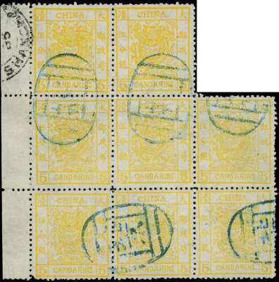 1883 Large Dragon, thick paper, 2½mm spacing, clean cut perf 5ca chrome yellow, in irregular block of eight, from setting VI (clichés: 7, 24/ 15, 1, 9/ 21, 19, 14) with intact selvedge at right, cancelled by several Peking seals in blue and by small part of Shanghai Customs cds with clear year ‘85’ date, very fine. An exhibition worthy rare multiple. SG 9: Chan 9