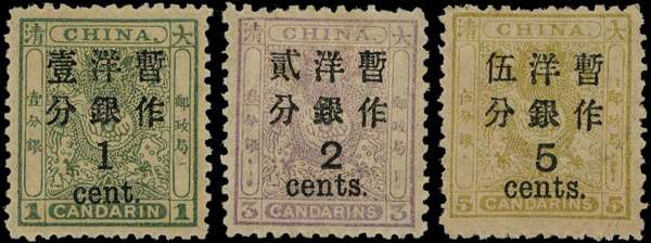 1897 large figure surcharges, spaced 1½mm on "Small Dragons", set of 3 to 5c on 5ca olive-yellow, large part o.g. SG 66-68