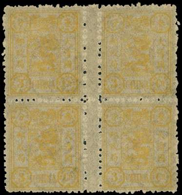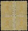 1897 60th Birthday of the Dowager Empress, third printing, large figures surcharge, narrow setting, 3ca pale chrome-yellow, vertical inter-panneau block of four showing ERROR SURCHARGE OMMITTED, full unmounted o.g. crease at top left, still an impressive and rare multiple. SG 78b; Chan 74b $5600+