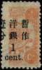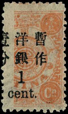 1897 60th Birthday of the Dowager Empress, third printing, large figures surcharge, 1½mm spacing, 1 cent. on 1ca pale red-orange, very narrow basic stamp of which a 2 mm strip at left is unprinted (!), the surcharge is normally applied but partially absent at left due to the narrowness of the stamp, large part o.g. a most peculiar and striking variety. SG 79var; Chan 75var