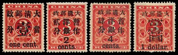 1897 (Jan) 1c on 3c deep red, 2c on 3c deep red, 4c on 3c deep red and $1 on 3c deep red,