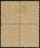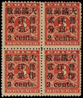 1897 Red Revenue, small figures surcharge, 2 cents on 3c deep red, in block of four, upper right stamp showing variety INVERTED in ‘S’ in ‘CENTS’ and lower right stamp variety, COMMA after ‘CENTS’ large part o.g. some tones still an attractive and scarce multiple. SG 93d,f; Chan 84e,f