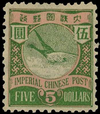 1897 Imperial Chinese Post, $5 yellow-green and rose, large part o.g. fine, a fresh example with above average centring. SG 107a; Chan 103